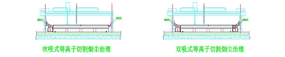 等離子切割所產生的煙粉塵主要集中于臺面下方、可通過滑動風道配合吸風小車進行收集治理 ,建議一般切割平臺≤4m可采用吹吸式收集,切割平臺≥4m的可采用雙吸式進行收集。